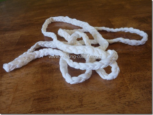 If you use strips from tee shirts or knit fabric, sew them together so they’re about 6 1/2 feet long each. It depends on what size your shirt is. It always a good idea to cut/sew everything longer than you think you’ll need. It is a lot easier to trim something than to miraculously make it longer.