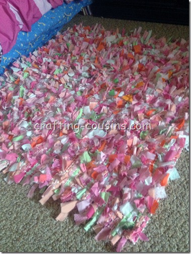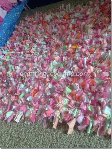 At least it’s organized! By color, and in some cases, by type of fabric (knits, satin, tulles, etc). And I cut 100s and 1000s of strips. All about 1” wide. But, instead of doing them just one tuck under and letting it be, I did different lengths of strips and wove them in through the non slip rug mat. After weeks of watching TV/movies, with my husband thinking I’m crazy (which I am), I finished 2 rugs!!